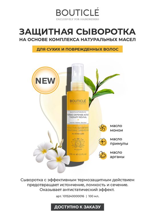 Защитная сыворотка на основе комплекса натуральных масел манои, примулы и арганы для сухих и поврежденных волос с эффективным термозащитным действием предотвращает истончение, ломкость и сечение. Оказывает антистатический эффект.