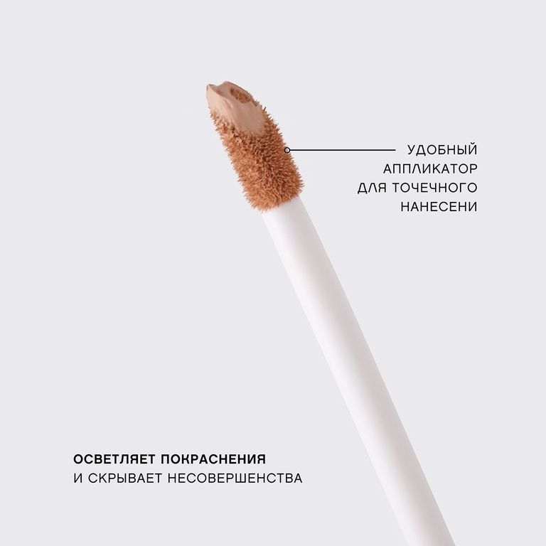 У него кремовая текстура в четырех натуральных оттенках и удобный ворсовый аппликатор, чтобы точечно наносить средство на несовершенства на лице.
